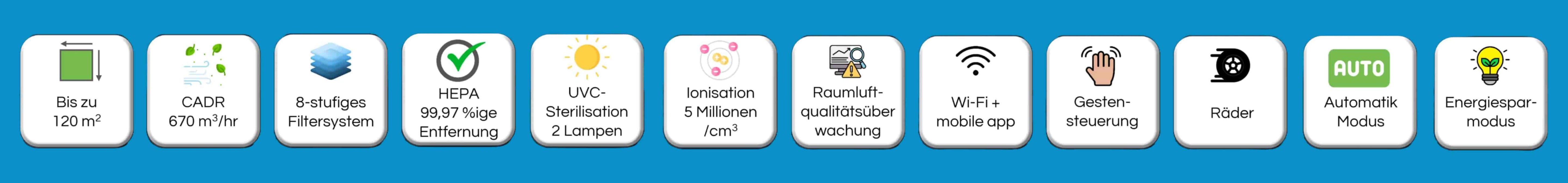 | Mehrschichtiger Filter | Vorfilter + antibakterieller Filter + Filter HEPA H13 medizinischer Qualität + Aktivkohlefilter + Photokatalyse |
