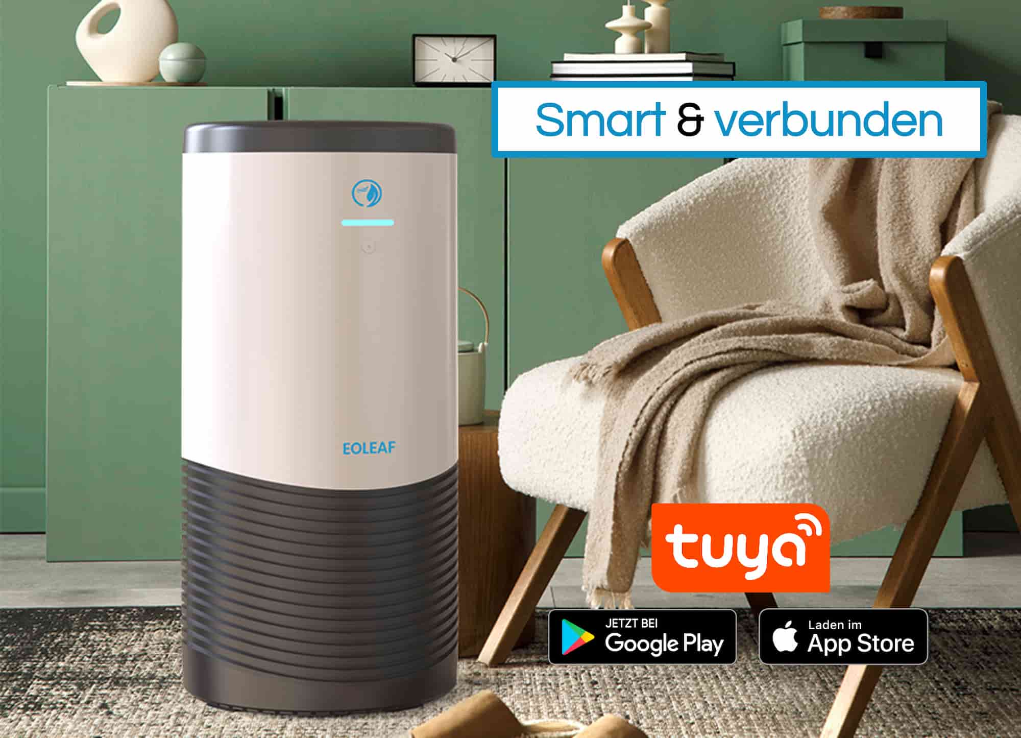 Alle unsere Luftreiniger sind mit Wi-Fi ausgestattet, sodass sie in die Tuya Smart-App (verfügbar für Android und iOS) integriert werden können. Dadurch können Sie Ihre Geräte direkt von Ihrem Telefon aus oder mit Sprachbefehlen steuern (kompatibel mit Google Assistant, Alexa und Siri). Sie können jetzt Ihren Luftreiniger steuern und Ihre Raumluftqualität aus der Ferne überwachen.