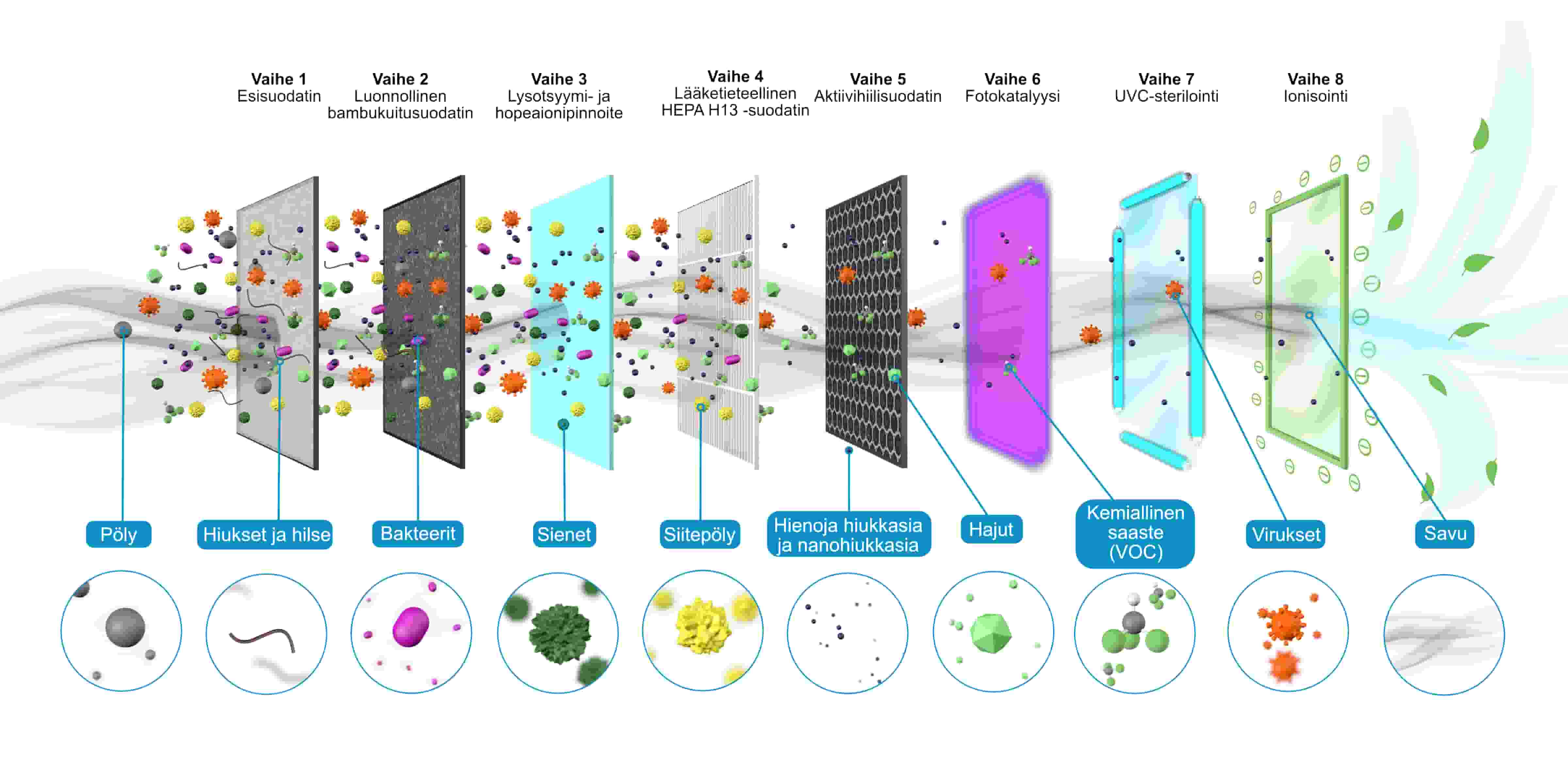 Ilmanpuhdistimissamme käytetään viimeisintä ilmansuodatustekniikkaa, jolla torjutaan kaikenlaisia sisäilman epäpuhtauksia ja tarjotaan tieteellisesti parempaa ilmaa. Suojaa terveytesi hengittämällä 99,97 % puhtaampaa ilmaa kotona ja työpaikalla.