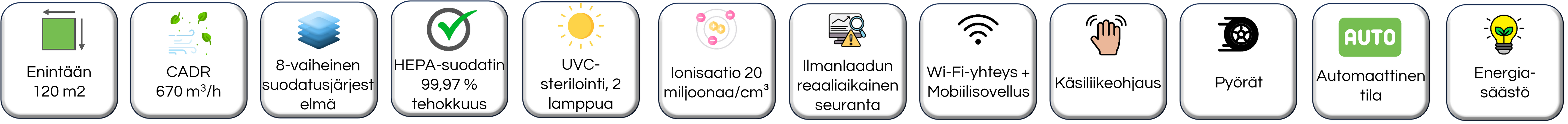 | Muita puhdistustekniikoita | - UVC-sterilointi (kaksi UV-lamppua 254 nm:n lämpötilassa) - Ionisointi (20 miljoonaa kpl/cm3) |