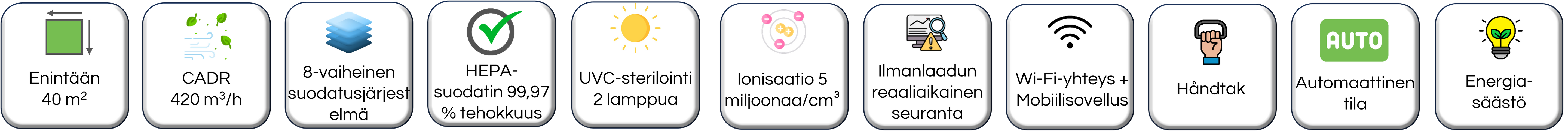 | Muita puhdistustekniikoita | - UVC-sterilointi (kaksi UV-lamppua 254 nm:n säteilyalueella) - Ionisointi (5 miljoonaa kpl/cm3) |
