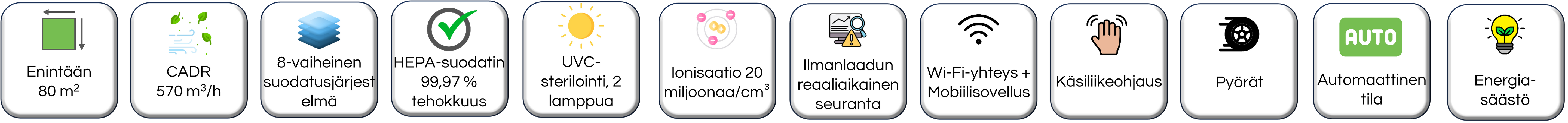 | Muita puhdistustekniikoita | - UVC-sterilointi (kaksi UV-lamppua 254 nm:n lämpötilassa) - Ionisointi (20 miljoonaa kpl/cm3) |
