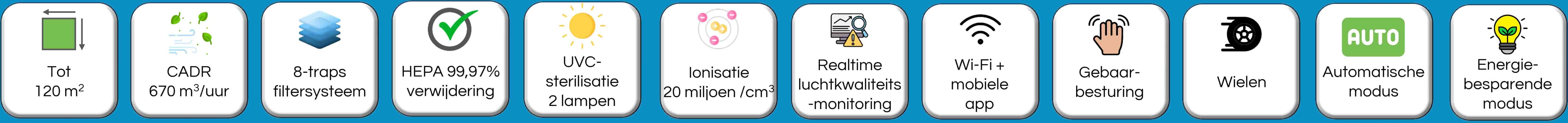 | Extra zuiveringstechnologieën | - UVC-sterilisatie (twee UV-lampen op 254nm) - Ionisatie (20 miljoen stuks/cm3) |