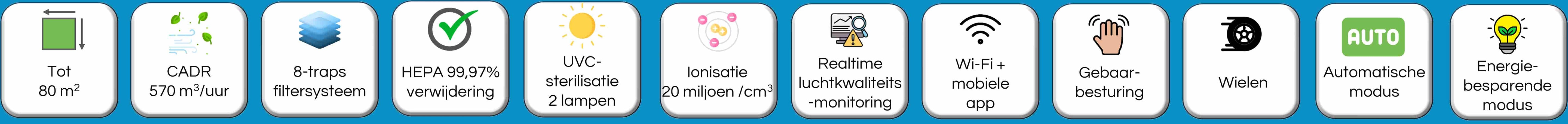 | Extra zuiveringstechnologieën | - UVC-sterilisatie (twee UV-lampen op 254nm) - Ionisatie (20 miljoen stuks/cm3) |