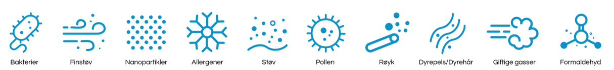 Våre luftrensere bruker en kombinasjon av klassens beste og medisinske teknologier for å filtrere og rense luften. De benytter en egenutviklet filtreringsprosess i åtte trinn for å fjerne alle luftbårne forurensninger fra inneluften: bakterier (virus, bakterier og muggsporer), fine partikler og nanopartikler (PM1.0, PM2.5, PM10), allergener (pollen, støv, støvmidd, dyreflass), kjemiske forurensninger (som VOC-er, formaldehyd, karbonmonoksid og mange andre giftige gasser), røyk (inkludert tobakksrøyk og eksosgasser) samt dårlig lukt.